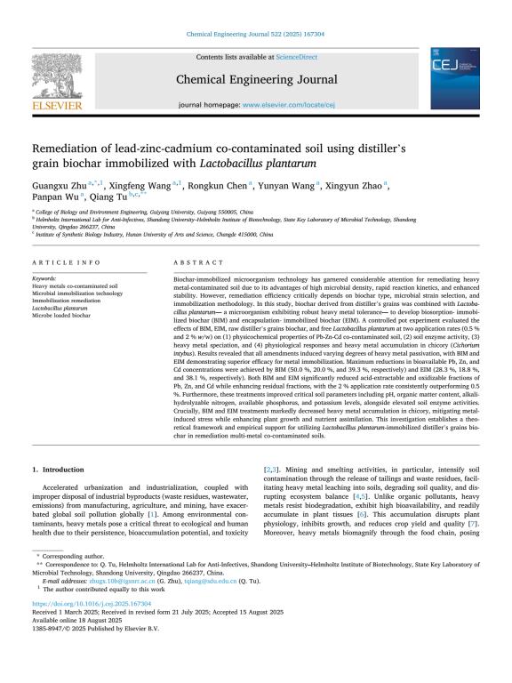 近日,我院涂强教授作为通讯作者参与的科研成果《Remediation of lead-zinc-cadmium co-contaminated soil using distiller’s grain biochar immobilized with Lactobacillus plantarum》在国际著名期刊《Chemical Engineering Journal》(中科院一区,IF=13.2)正式发表,论文在线发表于2025年8月18日。