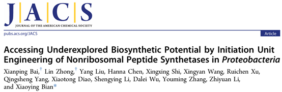 近日,我院钟林副研究员作为共同第一作者参与的科研成果Accessing Underexplored Biosynthetic Potential by Initiation Unit Engineering of Nonribosomal Peptide Synthetases in Proteobacteria”,发表于国际著名期刊《美国化学会志》(Journal of the American Chemical Society, JACS),该研究首次提出起始单元工程策略,并应用于激活沉默脂肽基因簇和人工创制脂肽,为深入拓展微生物生物合成潜力提供了新思路。